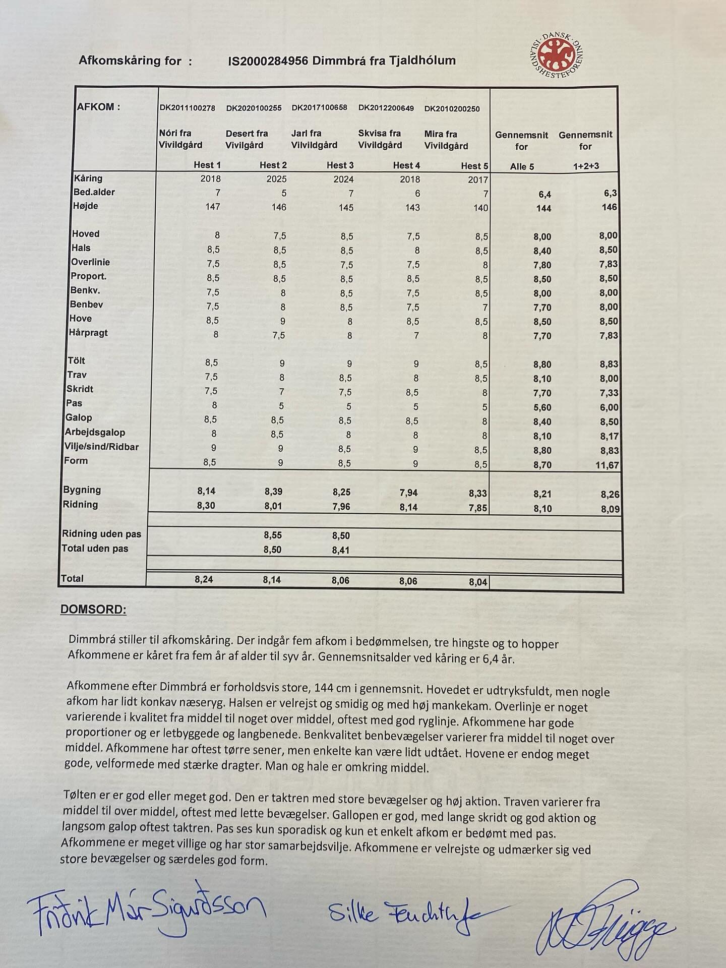 Desert er efter Viti fra Kagaðarhóli, der er kåret med 8,26 total og ærespræmie for afkom, samt Dimmbrá fra Tjáldhólum, der er Christinas tidligere top konkurrencehest og i 2025 fik tildelt ærespræmie for afkom.