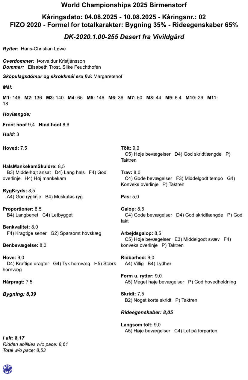 Herudover var Desert udtaget til at repræsentere Danmark i avlskonkurrencen ved VM 2025 i Schweiz. Her viste han sig flot frem med en kåring på 8,53 total w/o pace.